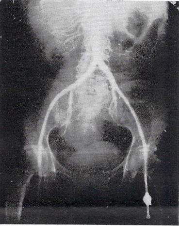 初の経大腿動脈法による腹部血管造影を報告した論文.鼠径部で大腿動脈を露出し,太い針(トロカール)で穿刺して尿管カテーテルを挿入し,ジオドラストを注入して大動脈造影を行なっている.検査後は動脈外膜を縫合,閉創する.まだ外科的侵襲は大きいとはいえ,大動脈の盲目的直接穿刺にくらべればかなり安全になったといえる.
