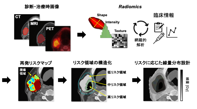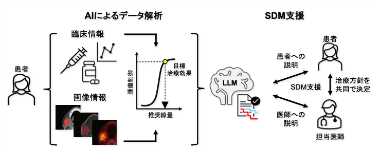 がん放射線治療において「どのくらいの線量が最適か」は、症例ごと、がんの塊の中でも部位ごとに異なります。本研究では、AIと画像解析技術を用いてがんの部位ごとの放射線感受性を定量的に評価し、腫瘍制御に必要な線量を推定する新たなモデルを構築します。さらに、大規模言語モデルを活用し、推奨線量とその根拠をわかりやすく提示することで、患者さんと医師が納得して治療方針を選択できるSDMを支援します。本システムにより、高リスク患者、高リスク部位にはより高い腫瘍制御を目指して高線量を、低リスク患者には副作用を抑えるために低線量を投与する情報を提供し、治療効果と副作用軽減の両立を実現することで、次世代の患者中心の個別化医療へと発展させていきます。