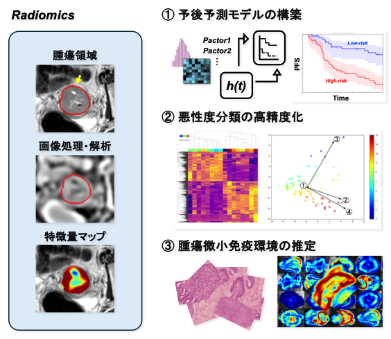 当大学産婦人科と共同で、子宮頸癌・子宮体癌に対する治療成績の予測や疾患特性の解明、診断・治療戦略の最適化に関する研究を進めています。Radiomicsは、CTやMRIなどの画像から抽出された数百〜数千に及ぶ画像的特徴量から疾患の予防・診断・治療・予後予測の質を高める研究分野です。さらに、臨床情報や遺伝子情報などと統合的に解析する統合オミクス解析もできます。本研究では、婦人科腫瘍に対して、① 生存率や再発リスクを予測する個別化モデルの構築、② 悪性度分類の高精度化による診断精度の向上、③ 腫瘍微小免疫環境の推定による新たな治療戦略の探索を目指しています。これにより、婦人科腫瘍における精密医療の実現に貢献することが期待されます。