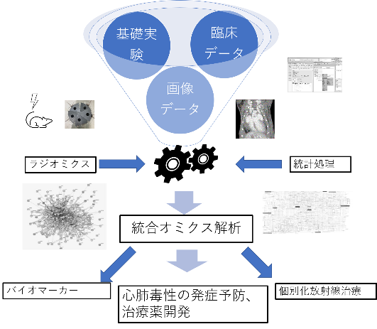 私たちの研究室では、胸部へのがん放射線治療の副作用である放射線誘発性心毒性、肺障害について、臨床で得られた結果を基に有害事象の発生を予測するモデルを構築し、さらにゲノム情報などを含めた統合オミクス解析を組み合わせることで、より高精度なリスク予測や個別化治療の実現を目指しています。