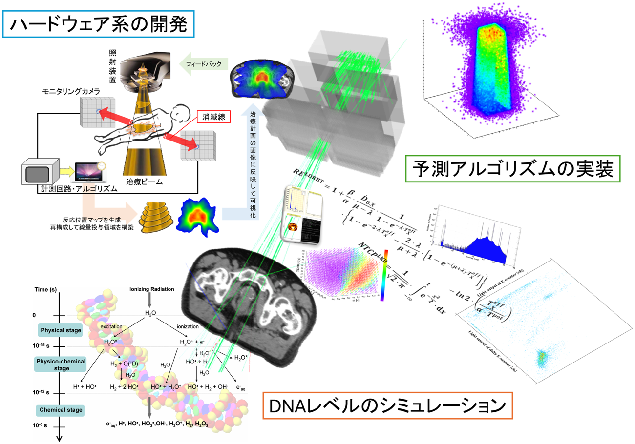 モンテカルロシミュレーションを中心に、計算科学・放射線物理学・放射線計測学を駆使して、次世代線量評価機構の構築に取り組んでいます。原子・分子のスケールによる線量評価からDNAレベルのシミュレーション、臨床応用までを一貫して探究し、精緻な線量計算基盤の開発を推進しています。さらに放射線検出器や計測回路などハードウェア系の開発や数理モデル・機械学習を用いた予測アルゴリズムの実装を通じて、治療計画の最適化と信頼性向上を実現し、患者ごとの個別化医療に貢献します。基礎研究から臨床まで幅広く挑戦できる学際的な研究環境で、次世代放射線治療の未来を切り拓いていきます。
