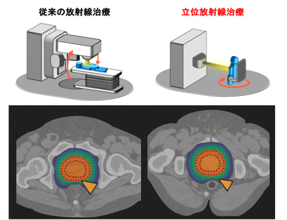 従来の放射線治療は、患者さんを仰向けに固定して、腫瘍を中心に治療装置が回転しながら照射する方法が一般的です。一方、立位放射線治療は、患者さんを座らせ、椅子ごと回転して照射する方式です(立位のこともあります)。この方法では、治療装置の簡素化やコスト削減、治療中の快適性向上、線量分布が改善するなど、多くの利点が期待されます。当大学放射線診断科では世界初の立位CT装置を開発し、社会実装しました。本研究ではそのデータを活用し、立位放射線治療のシミュレーション解析を行います。具体的には、同一患者の立位と臥位CTで、解剖学的変化や線量分布比較を解析することで、立位放射線治療の実現可能性を検証します。このようなデータを保有する施設は世界的にも稀であり、将来の放射線治療の発展に大きく寄与すると期待されます。