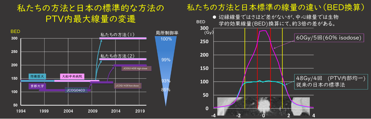 早期肺がんに対する体幹部定位放射線治療(SBRT)において、私たちは腫瘍中心部の線量を高く設定し、同時に周囲の正常肺組織の線量を低くする治療法を開発し、安全性を確認しました。この方法の導入から20年経過していますが、その間に治療を行った患者数は700名を超え、極めて良好な治療成績を認めています。日本のSBRTの標準的方法での局所制御率は85%なのに対し、この方法では99%を超え、ここ8年間で局所再発を1例も認めておらず、副作用も増えていません。この安全で良好な治療成績を示す方法の概念を応用し、心臓、気管支や食道などのリスク臓器に近い肺がんでは線量処方デザインを工夫しています。今後は、これらの治療成績を体系的に整理し、論文化を進めていく予定です。