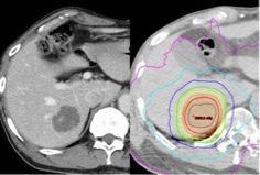 肝臓に対する体幹部定位放射線治療(SBRT)は、切除不能肝細胞癌や転移性肝腫瘍に対する有効な治療法として注目されています。まだ手術や他の治療法に比べて普及度は高くありませんが、今後さらに広がっていくことが期待されます。肝SBRTは比較的安全な治療法ですが、長期経過観察にて、稀に胆管狭窄を来すことがわかりました。そのため症例を集積・解析し、その特徴を明らかにする研究を進めています。また、基礎的な肝障害を有する患者における肝SBRTの臨床成績をまとめ、安全性と有効性を評価しています。
