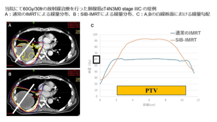 2018年以降、III期肺がんに対する化学放射線療法後に維持療法として免疫チェックポイント阻害薬が導入され、治療成績が大きく向上しました。しかし、いまだに18-30%の方が放射線照射範囲内からの再発を来すと報告されています。また、局所制御向上目的に米国にて線量増加試験(第3相試験:RTOG0617)が行われましたが、線量増加群(74Gy)でむしろ全生存率、無再発生存率が低下するという結果となりました。そこで当院および関連施設では定位照射の技術を応用し、病巣の中心部は線量を増加し辺縁は急峻に線量を下げる照射法を始めています(下図のSIB-IMRT)。すなわち、腫瘍に対しては高線量を投与すると同時に周辺組織の線量は低減することが可能となりました。この方法の治療成績や有害事象について現在解析しています。