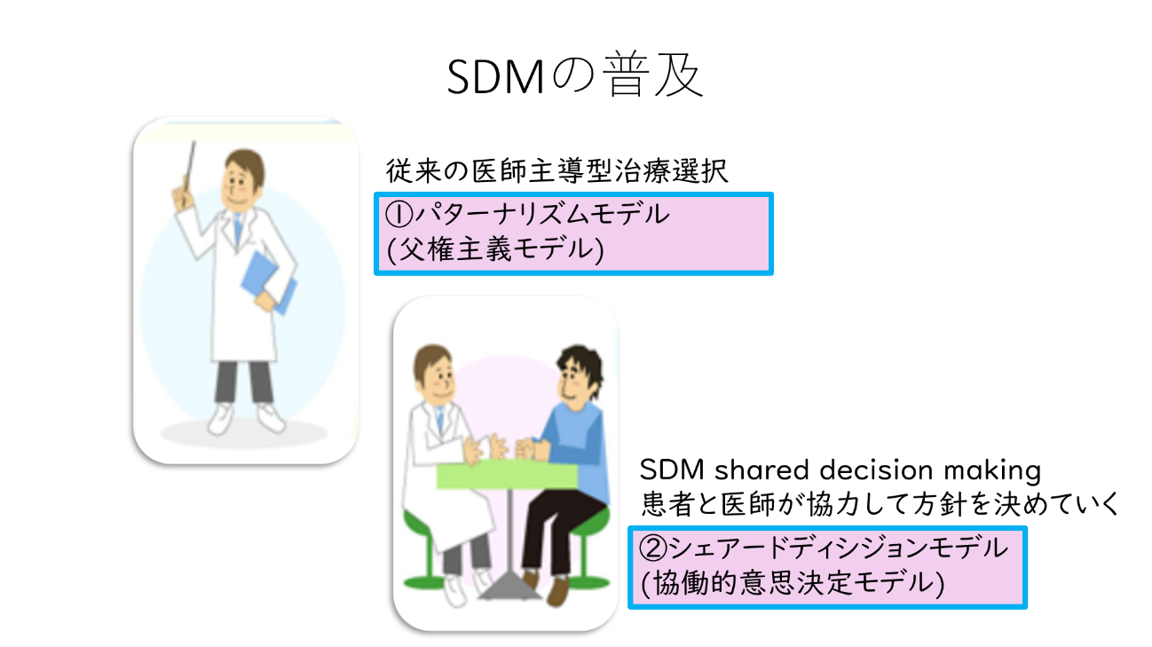 このような状況において、協働的意思決定(SDM:shared decision making)診療は、患者さんが納得して治療を選択できるだけでなく、患者さんの意向に沿った治療法の選択や、医療従事者との信頼関係の向上をめざす診療方法です。一方でSDMは診療に時間がかかり診療の効率化とは相反します。そのため医療の持続可能性(サステナビリティ)についての検証を行う必要があります。