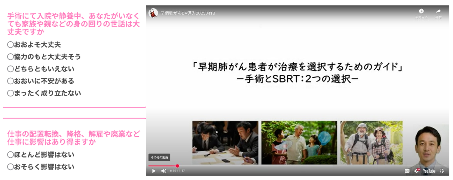 早期肺がんでは、外科手術による切除が標準治療として位置づけられています。一方、近年では体幹部定位放射線治療 (SBRT:stereotactic body radiotherapy) は、手術に近い成績が報告されています。日本の実臨床では主に手術不能、高齢者、または手術を希望しない際に考慮されており、手術可能な患者さんにはしばしば選択肢として提示されません。他方、アメリカやオランダでは、SBRTの割合は近年増加しており、オランダでは外科手術を上回っています。このため、SDMの一環として、早期肺がんの治療において手術およびSBRTの治療効果や副作用、日常生活への影響などを説明したpDA を作製しています。アンケート形式で各々の患者さんに最適な治療を模索することに加え、アバターを用いて視覚に訴えるナレーション映像を作製して組み込むことで、患者さんの理解を促進すべく改善を重ねています。